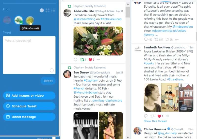 Tweetdeck is great for Creative groups, Charities and and for friends who like to help one another out. Each person logs in with their own account and, if they should leave or no longer want to be involved the account’s main login details have not been spread about or been at risk in an email.